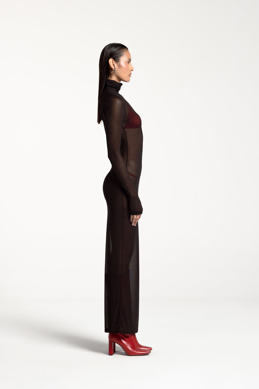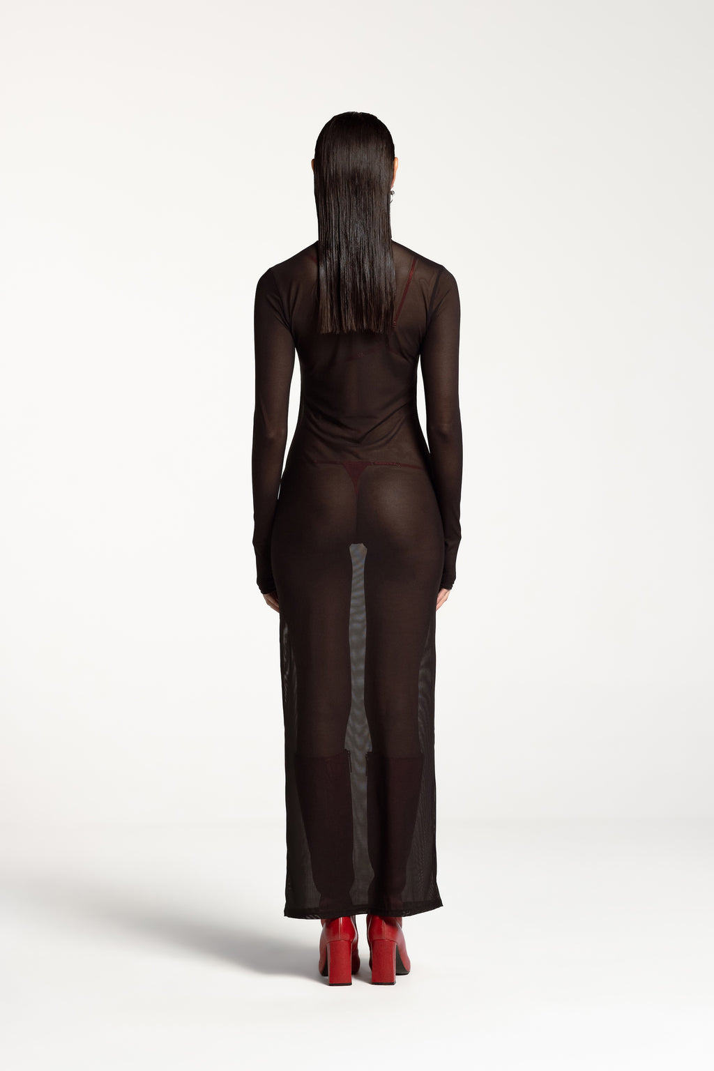 The CLAUDIA TURTLE NECK DRESS is crafted from mesh, featuring a relaxed fit and thumbhole details on the sleeves. Please note that lingerie is not included.