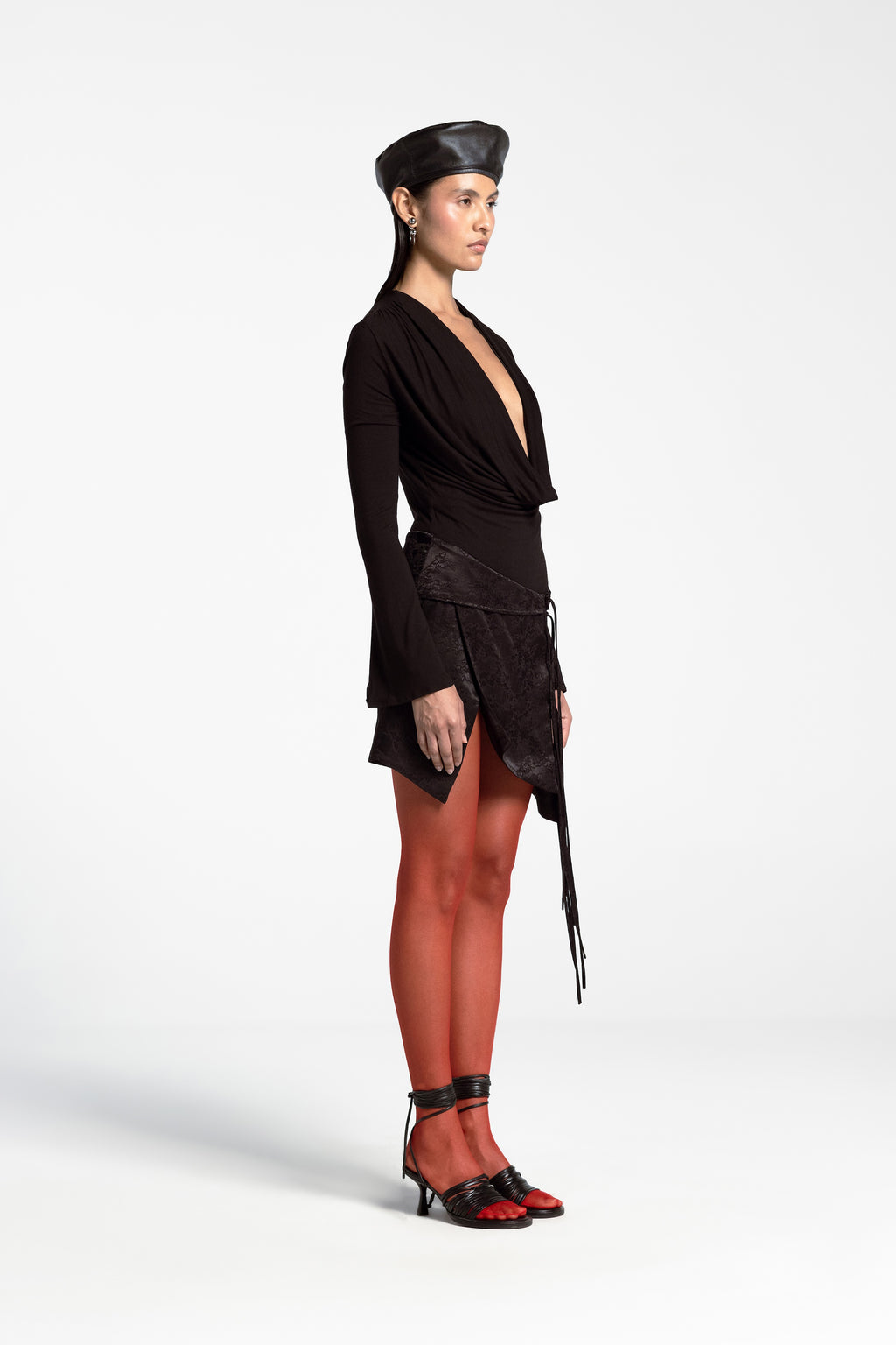 The JULIETTE MINI SKIRT is a stylish, asymmetric mini skirt made from eco-friendly jacquard fabric featuring an oriental pattern. The design includes delicate Japanese knot details on the front side of the leg. This sensual piece is inspired by fashion from the 2000s.