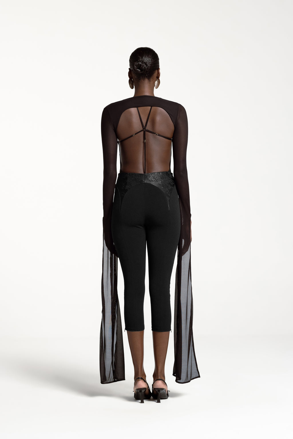 The MIA CAPRI PANTS are made of a super comfortable and figure hugging stretch crepe. They are an everyday companion and have sensual and unique cuts at front and back finished with our eco-friendly oriental design jaquard. Super comfortable and elegant design, ideal from daytime to night time from boardroom to party time.
